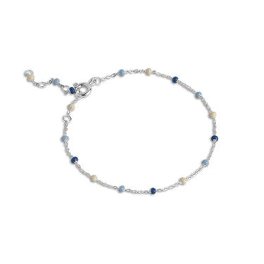 Lola armbåndet i farven marine har forskellige nuancer af blå og beige emalje langs kæden. Marine armbåndet er lavet med håndmalet emalje og lavet i sterlingsølv. Marine armbåndet kan tages på alene eller sammen med andre af vores armbånd