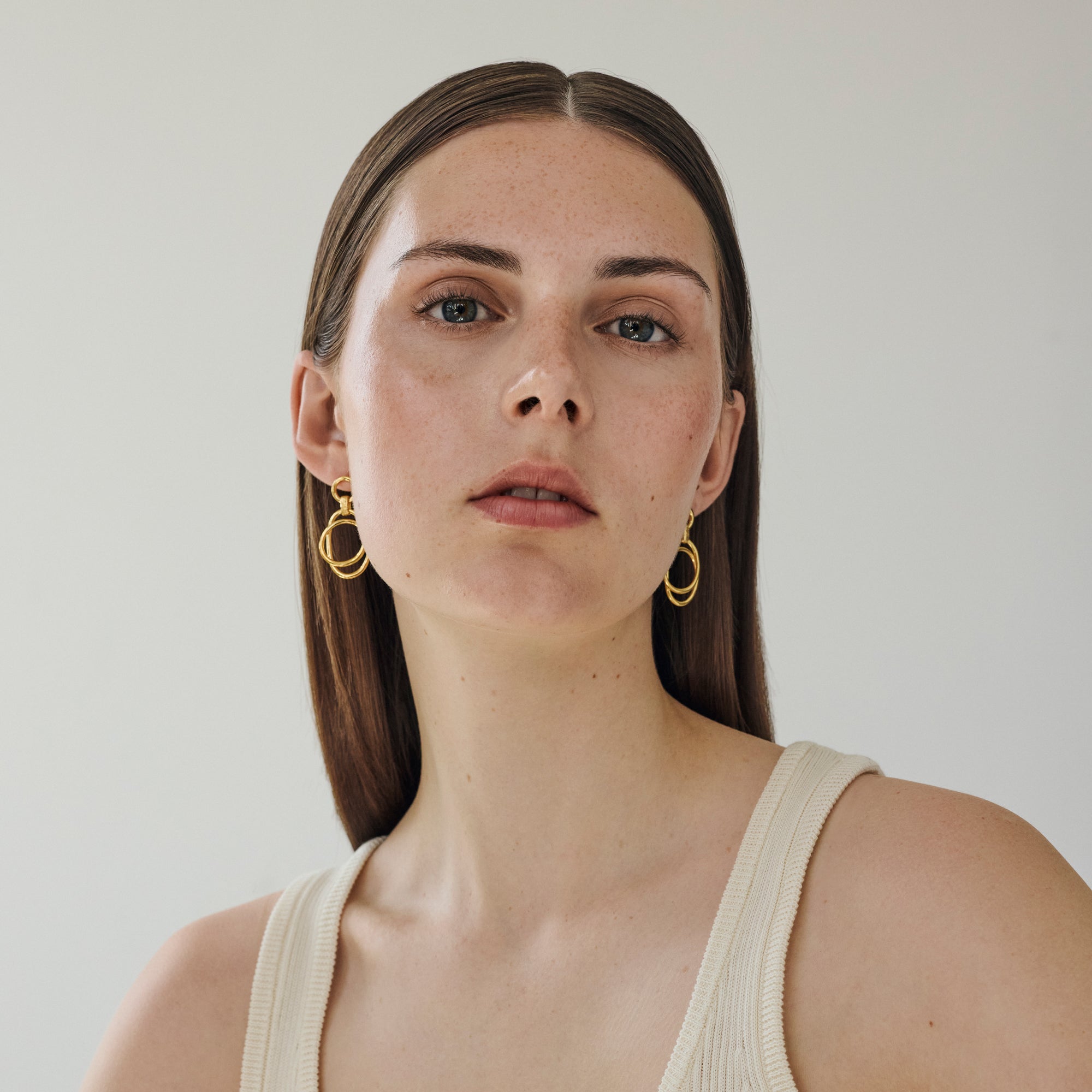 Om smycket:Carina Earring är en elegant och karaktärsfull örhänge som balanserar det mjuka med det slående. De organiska ringarna hänger löst tillsammans och skapar en vacker, rörlig uttryck, medan den hamrade detaljen lägger till en touch av rå elegans. Bellu har ett slående volym men är även lätt att bära.