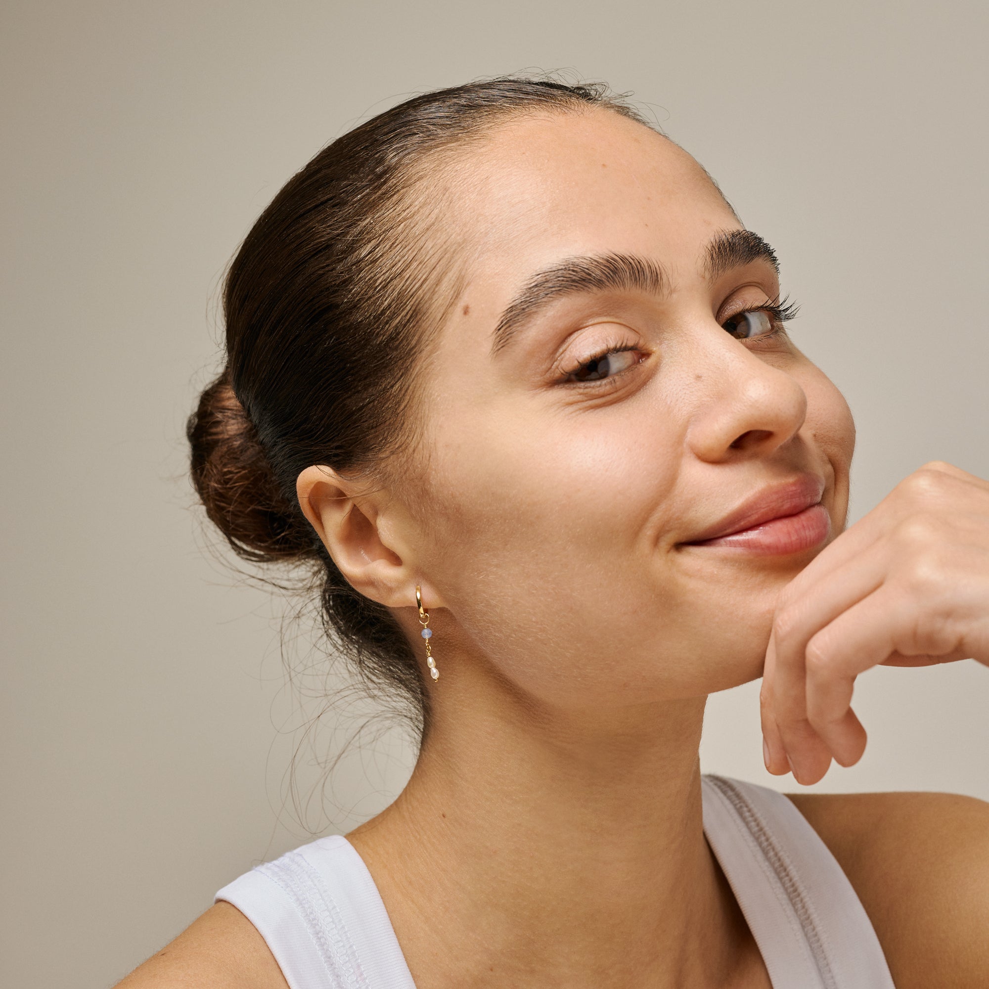 Om smycket:Liva hoop i färgen Blue Quartz skiner vackert som en solbelyst havsyta. Stenen har små, naturliga oegentligheter som ger örhänget dynamik och charm.