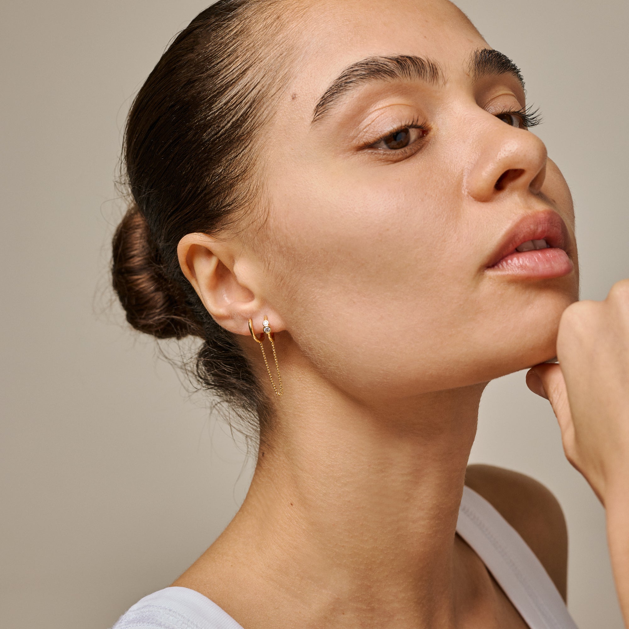 Nova Chain Hoops är en modern tolkning av den klassiska hoopen - med en överraskande twist. Denna unika dubbla hoopörhänge består av två små, blankpolerade hoops som är sammanlänkade med en fin kedja, vilket skapar illusionen av två separata örhängen, men som i själva verket hänger ihop som en. Ena hoopen är prydd med två klara cubic zirkonia-stenar, som ger glans och elegans. Designen är speciellt skapad för dig med två hål i samma öra, och stilen kombinerar minimalistisk kedjeörhänge med en rå ändå raffinerad uttryck. Båda hoopen har klicklås, vilket gör dem lätta att ta på och säkra att bära. Nova Chain är perfekt för dig som älskar att styla öronpiercingar kreativt och vill ha något annorlunda men ändå elegant. Använd Nova Chain ensam som ett statement - eller blanda den med små studs och hoops för en personlig, lager-på-lager look. Obs: Nova Chain säljs individuellt.