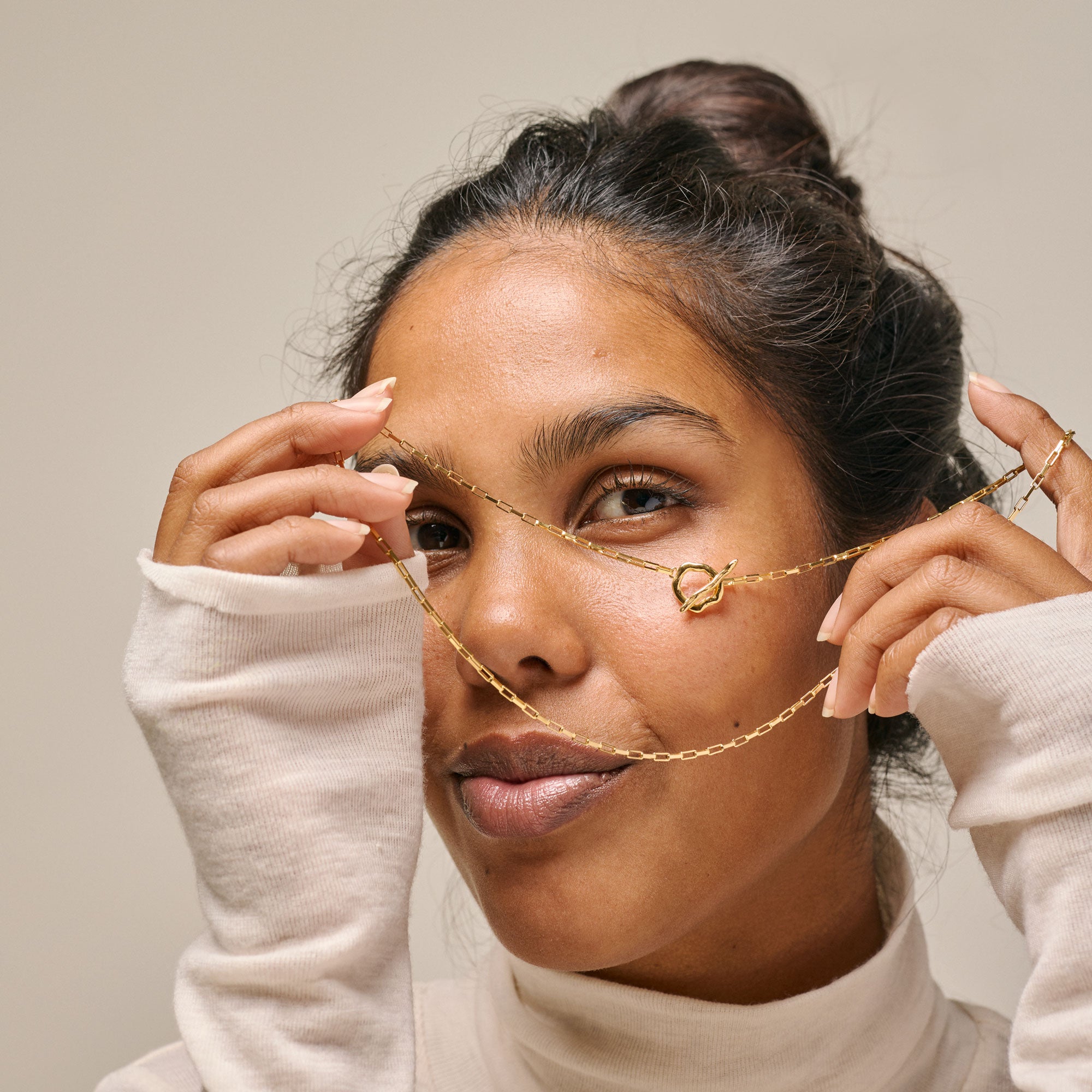 Om halsbandet:De böljande, organiska länkarna på halsbandet Noel fungerar perfekt med de geometriska uttrycket av de kvadratiska länkarna på kedjan och skapar en feminin och modig look. Noel halsband har en unik design, vilket gör det iögonfallande för både vardag och fest. Halsbandet stängs endast framför och kan därför stylas på olika sätt.