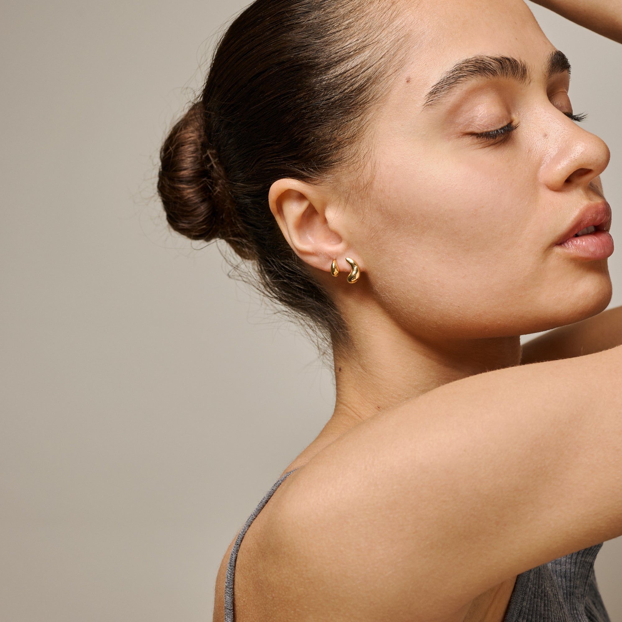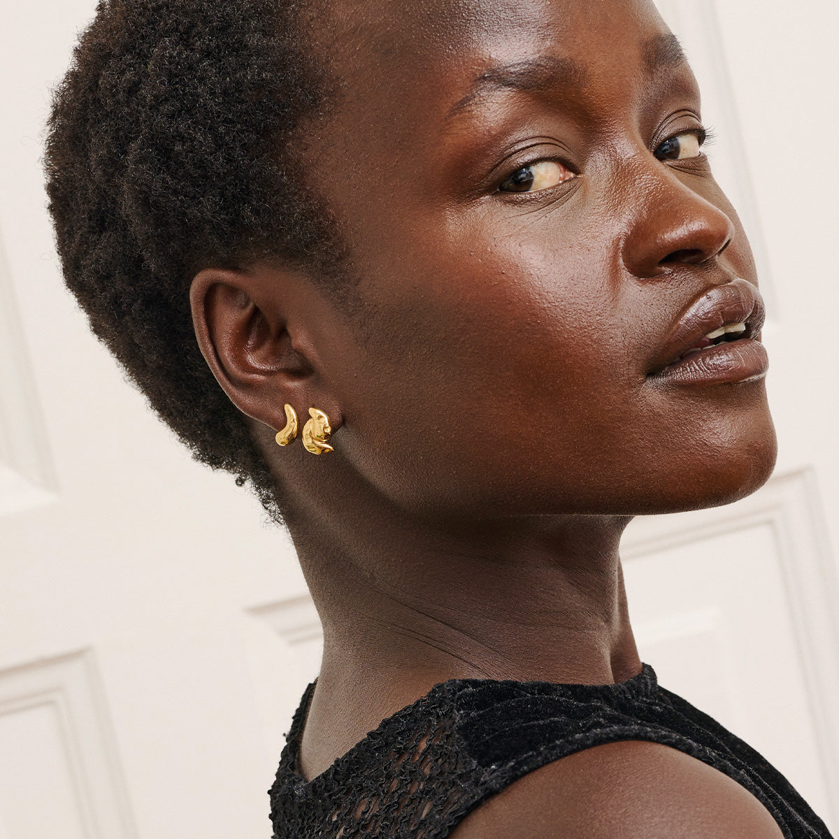 Om smycket:Nima Stud är en liten, elegant öronnål med en mjuk, organisk form och en lätt vågig yta. Den blanka finishen ger den en exklusiv touch, och den kompakta designen gör den idealisk för både vardag och mer sofistikerade looks. Bär den ensam för en minimalistisk uttryck – eller kombinera med flera stilar för en personlig look. Nima stud är belagd med 18 karat guld, men finns även i en silverversion.